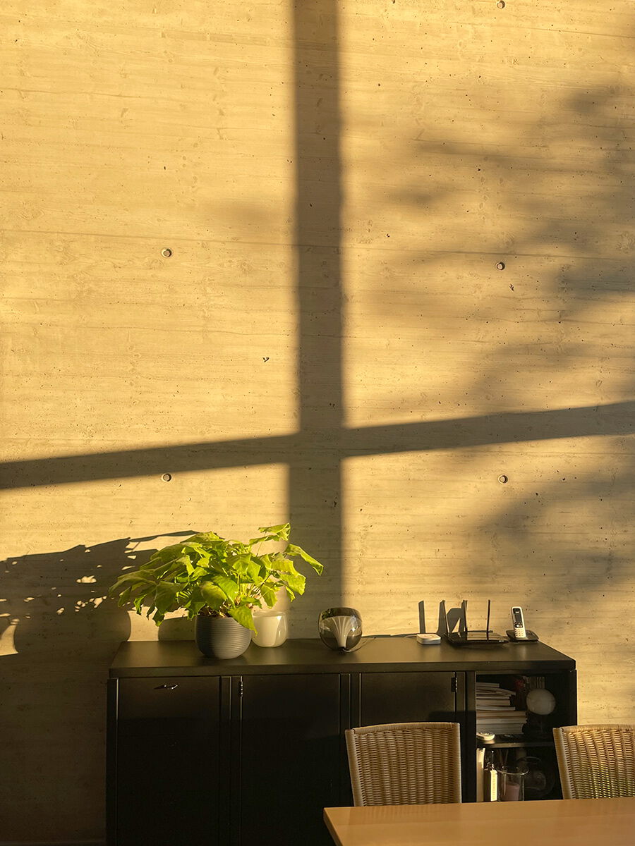 Aufgrund der bis unter die Dachfläche geöffneten Ostfassade und dem bis unter den First geöffneten, nach Westen gerichteten Licht-Spalt im Treppenhausbereich, bietet das Gebäude trotz seiner Nordorientierung ein hohes Maß an weichem Zenitlicht - und an sonnigen Tagen eine Fülle von wechselnden Lichtstimmungen.