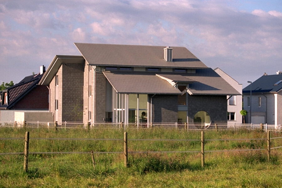Das Baurecht definiert Baugrenzen, die der sich verschmälernden Straßenbreite folgen und einen gegliederten Grundriss fordern. Dem Gedanken des sich in die Blickachse des Erschließungsweges einschiebenden Baukörpers folgend, bildet sich das Gebäude in seiner Grundstruktur aus einzelnen, gegeneinander klar ablesbaren und zueinander verstaffelten Baukörpern aus. Diese einzelnen Kuben sind auch in der dritten Dimension in ihrer Bauhöhe sowie in ihrer Dachausbildung klar erkennbar, da die jeweiligen Pultdachflächen zueinander unterschiedliche Höhen und Ausrichtungen einnehmen. Dabei ist der zum Landschaftsschutzgebiet orientierte Gebäudeteil der am niedrigsten ausgebildete, der dadurch einen sinnfälligen Übergang vom "Stadtraum" zum "Naturraum" definiert. Zum Erschließungsweg hin zeigt sich die gesamte Fassade des mittleren Bautraktes - gewissermaßen als markanter Hochpunkt der gebauten Struktur - ortseinwärts gerichtet.