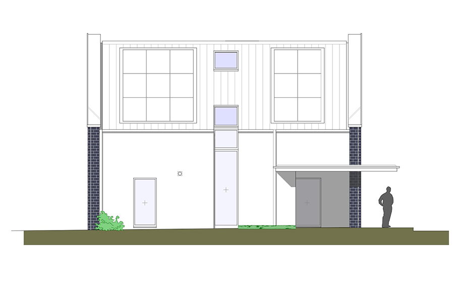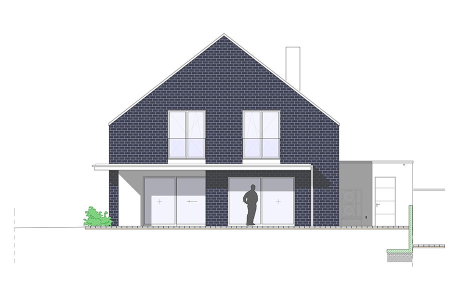 Der aus dem im seitlichen Bauwich angeordneten Garagenflachdachkörper ausgebildete, überdachte Entréebereich bietet einen witterungsgeschützen Zugang zur Haustüre und zur Garage, sowie einen Be- und Entladebereich für einen PKW an. Der Satteldachbaukörper besitzt eine vollverklinkerte vordere und rückwärtige Giebelfläche, sowie mit Wärmedämmverbundsystem verputzte Trauffassaden.